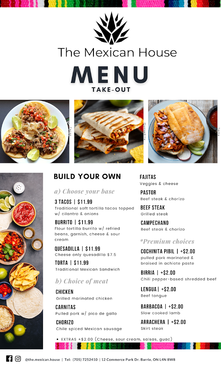 The Mexican House - Latin Market in Barrie, ON, offers an authentic taste of Mexico through its vibrant menu filled with traditional dishes and comforting Latin American flavors. Highlights include the crispy Flautas, rolled tortillas stuffed with tender chicken and topped with fresh lettuce, creamy sour cream, and cheese. The hearty Plato Típico showcases grilled beef or chicken with onions, paired with refried beans and salad, delivering robust, smoky flavors.